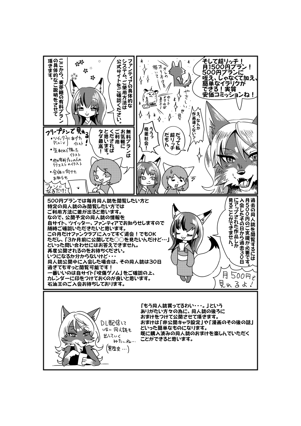 ファンティア10月以降の公開同人誌とか Fantia 2017年09月02日 そろそろファンティアに登録して1年になります。 あっっという間の1年でした!!! もうそんなに経ったの!!? うそーん!! 月に一回、過去の同人誌を公開しつつリクエスト絵をちまちま更新してきました。 数年前の同人誌とかを編集しているとやっぱりちょっと恥ずかしい気分になったりします(笑) まぁその分成長しているということで(;^ω^)ッテイウコトニシトイテ 当サイトに来月からの公開同人誌の早見表を専用ページに載せたのでご確認ください。 あ、これ読みたい!というのがあったらその月だけファンになるっていうこともできるので是非ご利用ください~ M=10月公開であとは随時公開です。 -------------------------------------------------------------- 同人の中の人の話になってしまいますが、通年同人活動をしているとはいえ、弱小サークルが年に数冊同人誌を出したり出さなかったりしているとだんだんと活動資金の底がチラチラ見えてきて次の本作れるのか?イベント出れるのか?という不安が出たり出なかったりします。うん、出ます(笑) 同人なんだから赤字でもいいじゃん!イベントで印刷代回収できればいいじゃんっていうのはもちのろんで、赤字でも楽しきゃいいじゃん趣味なんだし~というスタンスでやっていきたいものだけど、それでもやっぱりお金ないと活動はできませんね、現実(ひぎぃ) ココだけの話、活動初期の頃(ふぁーすと2くらいの時)はサークル身内にお金借りて本を印刷してました!!! だってん万円だもん!あっはっはっはー!高ぇ!!!でも本出したい!!!って感じでした。 でも、みんなが本を買って読んでくれたのでイベント活動も何年も続いて、たまにグッツも作れました。今はお金借りてませんぜ(笑顔) そして今回、ファンティアに登録して今までとまた少し違うパトロン形式の活動を始め一年継続しました。 支援が全くなかったらどどどどうしようなんて思いましたが、継続的に支援して頂き有り難い限りです。 支援して頂いた資金は成人向け単行本購入、けもケット参加資金に、今後はクリップスタジオEX購入と次回冬コミ(受かるかは未定だけど)の資金に充てさせていただきます。 だんだん公開する同人誌の残りが少なくなってきているのでその後はどうしようか…と考え中でもありますがコンスタンスに活動していければと思います。 今後もよろしくお願いします。