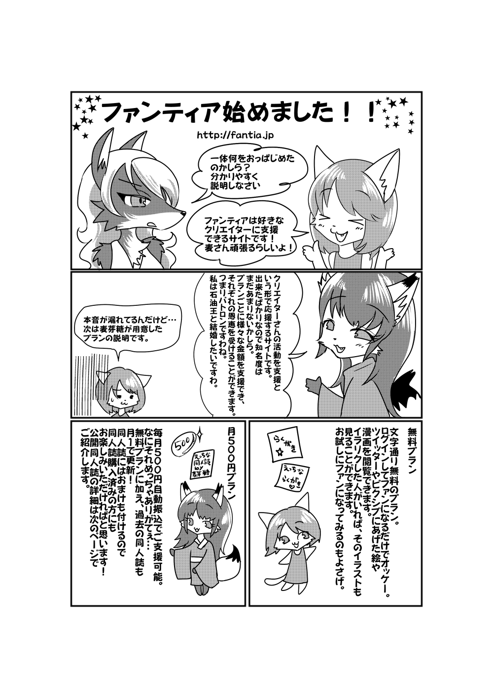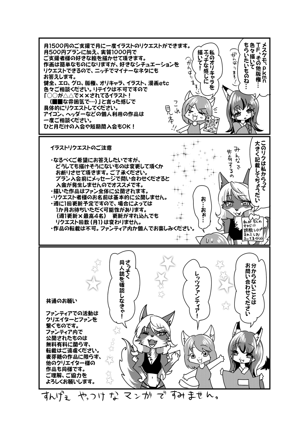 ファンティア10月以降の公開同人誌とか Fantia 2017年09月02日 そろそろファンティアに登録して1年になります。 あっっという間の1年でした!!! もうそんなに経ったの!!? うそーん!! 月に一回、過去の同人誌を公開しつつリクエスト絵をちまちま更新してきました。 数年前の同人誌とかを編集しているとやっぱりちょっと恥ずかしい気分になったりします(笑) まぁその分成長しているということで(;^ω^)ッテイウコトニシトイテ 当サイトに来月からの公開同人誌の早見表を専用ページに載せたのでご確認ください。 あ、これ読みたい!というのがあったらその月だけファンになるっていうこともできるので是非ご利用ください~ M=10月公開であとは随時公開です。 -------------------------------------------------------------- 同人の中の人の話になってしまいますが、通年同人活動をしているとはいえ、弱小サークルが年に数冊同人誌を出したり出さなかったりしているとだんだんと活動資金の底がチラチラ見えてきて次の本作れるのか?イベント出れるのか?という不安が出たり出なかったりします。うん、出ます(笑) 同人なんだから赤字でもいいじゃん!イベントで印刷代回収できればいいじゃんっていうのはもちのろんで、赤字でも楽しきゃいいじゃん趣味なんだし~というスタンスでやっていきたいものだけど、それでもやっぱりお金ないと活動はできませんね、現実(ひぎぃ) ココだけの話、活動初期の頃(ふぁーすと2くらいの時)はサークル身内にお金借りて本を印刷してました!!! だってん万円だもん!あっはっはっはー!高ぇ!!!でも本出したい!!!って感じでした。 でも、みんなが本を買って読んでくれたのでイベント活動も何年も続いて、たまにグッツも作れました。今はお金借りてませんぜ(笑顔) そして今回、ファンティアに登録して今までとまた少し違うパトロン形式の活動を始め一年継続しました。 支援が全くなかったらどどどどうしようなんて思いましたが、継続的に支援して頂き有り難い限りです。 支援して頂いた資金は成人向け単行本購入、けもケット参加資金に、今後はクリップスタジオEX購入と次回冬コミ(受かるかは未定だけど)の資金に充てさせていただきます。 だんだん公開する同人誌の残りが少なくなってきているのでその後はどうしようか…と考え中でもありますがコンスタンスに活動していければと思います。 今後もよろしくお願いします。
