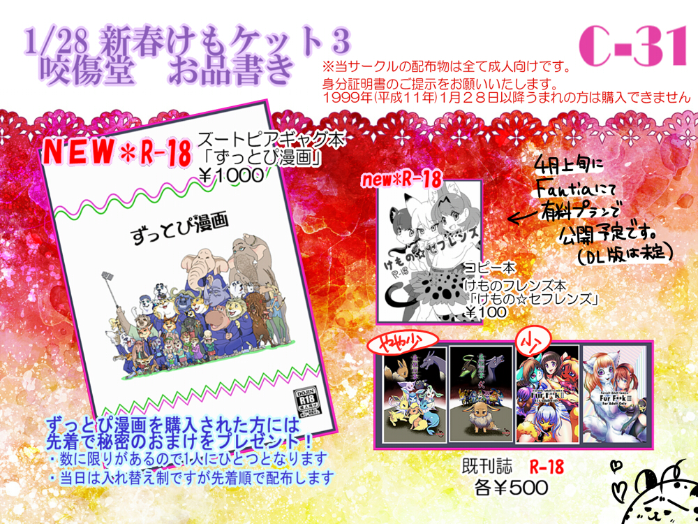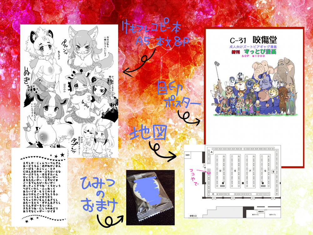 新春けもケット3お疲れ様でした!etc 同人の話 2017年02月01日 遅くなりましたがあけましておめでとうございます! 2017年もよろしくお願いします! 2017年一発目のイベント「新春けもケット3」に無事参加してきました! ブログでの事前告知をすっかり忘れてしまっていたよ(;0;) ツイッター、pixivで告知していた通り今回冬コミが落選だったので、そこで出そうと思っていた ズートピアギャグ漫画「ずっとぴ漫画」を出させて頂きました! あとけもフレで突発コピー本 もう読んでくれたかな? 早速「酷い」「よくまぁここまで…」「笑える」といったありがたい感想を頂いております! ね、デ○ズニーに怒られても仕方がないんじゃないかと震えるような内容になってます。 エロくはないんですよ?エロくはないんです、シコれないんです。 でも、心温まるひっどい下ネタのオンパレードなので成人向けにしました。やばす。 アリスブックスhttp://alice-books.com/item/show/795-12 とらのあなhttp://www.toranoana.jp/mailorder/article/04/0030/49/52/040030495201.html こちらでも手に入るのでどうぞご利用ください! で、公開していたおしながきがこれ ここにあるひみつのおまけ。なんだろうひみつって… 当日先着で配ったノベルティなんですが、その正体がこれ 漫画の中に出てくるお菓子その名も「ビンペニちゃんクッキー」 作中でニックが食べています。ははっ僕の遊び心だよ 当日はラベルで隠して「本を読んでから開けてね」ってかいておいたので 漫画を読んだ人はすぐにピンときたのでは?? 隙間から絵柄を見て「チンコが見える」という声に「せやせやw」というセクハラ攻撃もしたり。 楽しい。実に楽しい。 当日はいろんな方に会えたのも楽しかったぜ!ご挨拶できた方もいたし! いつも来ていなくて申し訳ねェ…! 新春には来れたよ! みな元気そうで何より何より(^∀^) またイベントでお会いしようぞー! 今回沢山既刊誌を もって行きましたが、退化の宴と着ぐるみ本2巻は完売しました!ありがとうございました! 着ぐるみ2巻は通販であと数冊のみの取り扱いです。宴は再販未定です。 宴は3巻も発行予定なのでどうにかしてもう一回だけ再販したいですが、うーーんうーーーーん…!!うーーーーんうわあああああ!そのうち考える(現実逃避) そんな感じで、今年もちらほらイベント参加していきたいと思います! 次の参加予定は 5月6日の「けもケット6」です!申し込みました! 連休中だから新春よりも来れる人が増えるかな? あと、5月28日の 「アブノーマルコミックデイ!3」という特殊性癖オンリー即売会にも 初参加予定です。こちらはスペース頂いて配置待ちです! 文字通りマニアックな同人誌が集まるイベントみたいで、主催は「りょなけっと」等を開催しているところで、もうずっと行ってみたかったイベントです。 けもケの新刊をそのままもって行く予定です。あともう一冊だせればいいなぁ… 同じく、これまたずっと出たかった3月の「異種ラブ3」ですが、日程が合わずこちらは断念です… あぁまた駄目だったお… 去年9月から始めた「fantia」ですが、沢山の方に見て頂いたりリクエストを描いたり毎月支援して頂いてます! 今年も頑張りますのでよろしくお願いします~♪ なんか、クレカ決算のみだったのがコンビニ決算も可能になったのでお気軽に利用できるようになりました! うおおお僕頑張る!早速2月の公開同人誌も公開せねばー! もうひとつアカウントをもっているパトロンサイト「enty」ですが、今沢山の方にフォローして頂いている状態ですが、今はあっちもこっちもという余裕がないので、こちらはもう少し放置させて頂きます(´・n・`)oh… そのうち時間ができたらentyでの特別な活動をしたいです。 久々のブログで長くなっちまったぜ…!